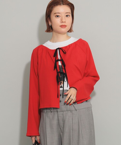 ラフに可愛くきまる■デザイントレンド感満載のリブカーディガンは、前衿ぐりにベロアリボンが通っており、リボンの結び方次第で衿の開き具合を自由に調整できます。グラン切り替え部分はざりげなく断ち切りにし、カジュアルでラフな雰囲気に仕上げました。■コーディネートキャミワンピースの上にさらっと着ていただいたり、ブラウスの襟を出して綺麗めに着ていただくのもおすすめです。■サイズレイヤードも楽しめる程よくゆったりとしたサイズ感。■素材リブ素材を使用しており、肌触りが良く、長時間の着用でも快適です。■ケア方法手洗い可(詳細は商品についている洗濯表示タグをご覧ください。)【GREY】Model:H168 B75 W60 H87 Size:ONE SIZE【RED】BEAMS STAFF:H164 Size:ONE SIZE※光の当たり具合やパソコンなどの閲覧環境によって、実際の色味と異なって見える場合がございます。予めご了承ください。※商品の色味は商品単体で撮影した画像をご参照ください。