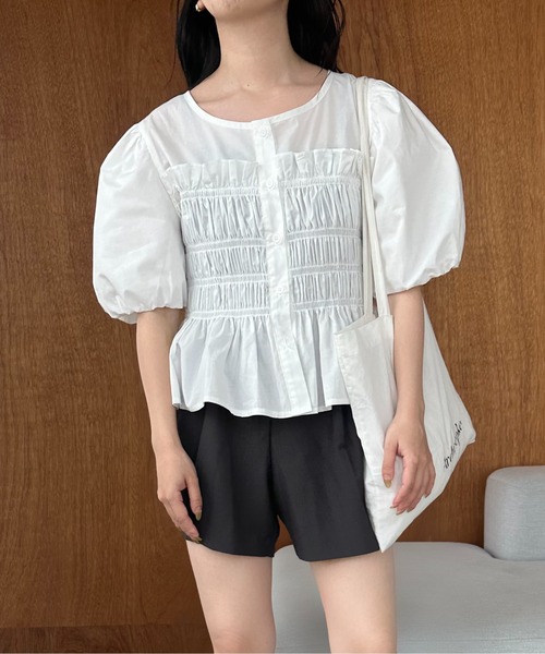 【シャーリングフリルパフブラウス】・ウエストにシャーリングを入れたシルエットが魅力的なブラウス・フリルたっぷりで存在感のある一枚です・バルーンスリーブで華奢見え効果あり・裾がフレアなので、タイトなボトムスやスカートとの相性抜群・前開きなのでキャミソールを中に着用し、羽織としても◎透け感:ホワイト/ブルーややあり ネイビーなし 伸縮性:なしlawgy" ラウジーlaugh(笑顔)+ energy(エナジー)毎日笑顔で過ごすエネルギーになりますように。心を込めて…。