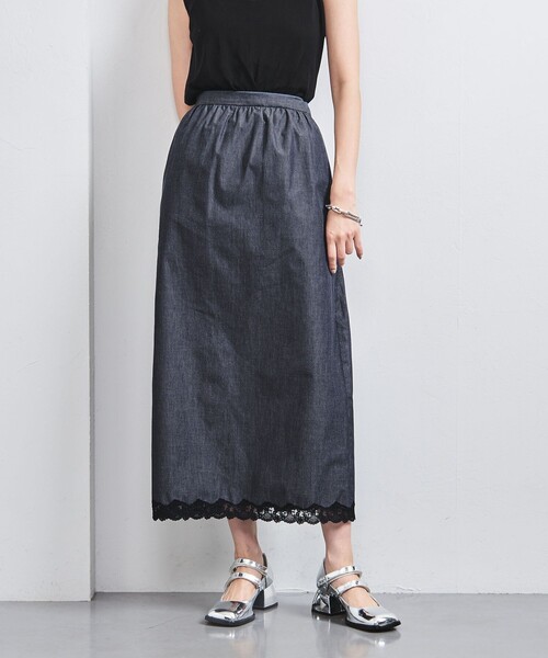 裾のレースが女性らしさを添えるタイトスカート ■デザイン すっきりとした縦のシルエットが美しいロングスカート。 フェミニンなモチーフを施しながらもクールな印象を与える一着。 バックウエストはゴム仕様で快適な着心地なのも魅力です。 ・レースの色は濃いネイビーです。 ■素材 毛羽の少ないコンパクトコットンを使用し、高密度に織り上げたダンガリー素材。 インディゴを使用していないので、色落ちが少ないのが特徴です。 ■コーディネート 同シリーズのブラウスとのセットアップ着用がおすすめ。 ベーシックなTシャツやニットの他、オーバーシルエットのシャツやブルゾンともバランス良くお召いただけます。 ・同素材の他アイテムのご用意もございます。 ブラウス 対象品番:15161625363 パンツ 対象品番:15141625363 ・生地が異なりますが、対象品番:15241621621と同デザインです。 ============================ 裏地:なし 透け感:なし 伸縮:なし 光沢感:なし ケア方法:手洗い可・ドライクリーニング ============================ 【注意事項】 ※商品を使用前に、タグ等に記載されている「取り扱い上の注意書き」、「洗濯表示」を必ずご確認ください。 ※商品画像は、光の当たり具合やパソコンなどの閲覧環境により、実際の色味と異なって見える場合がございます。あらかじめご了承ください。 ※商品の色味の目安は、商品単体の画像をご参照ください。 店舗へお問い合わせの際は、全国のUNITED ARROWS各店舗まで下記の品名/品番をお申し付けください。 品名:UWSC DGR LACE CMB TT 85 品番:15241625363
