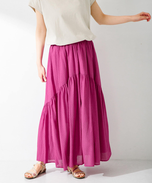 表情感のあるワンティアードスカート ラメ糸を織り込んだ夏らしいスカート。 ティアードの切替えをアーチ状にすることでスタイルアップ効果を狙えます。 ウエストはオールゴムでストレスフリーな着心地◎ 表面感のある素材なので、シンプルなトップスと好好相です。 POINT ・ウエストゴムで快適な穿き心地 ・ご自宅で手洗い可能 COORDINATE ゆるっとしたTシャツやノースリーブなど、カットソー合わせがおすすめです。 【2024 Spring/Summer】【24SS】 ※この商品は、素材の特性上、素肌に直接触れると刺激を感じることがあります。 ※水分や汗、摩擦(特に湿った状態での)などにより、色落ちや色移りすることがありますので、着用時・クリーニングの際は充分ご注意下さい。特に濡れたまま放置しますと、他のものに色移りしたり、色泣きすることがありますのでご注意ください。 ※その他お取り扱いに関しましては、商品に付属のアテンションタグをご覧ください。 ※商品画像は、光の当たり具合やパソコンなどの閲覧環境により、実際の色味と異なって見える場合がございます。予めご了承ください。 ※商品の色味の目安は、商品単体の画像をご参照ください。 ▼お気に入り登録のおすすめ▼ お気に入り登録商品は、マイページにて現在の価格情報や在庫状況の確認が可能です。 お買い物リストの管理に是非ご利用下さい。 素材感 透け感 : なし 伸縮性 : なし 裏地 : あり 光沢 : ややあり ポケット : あり