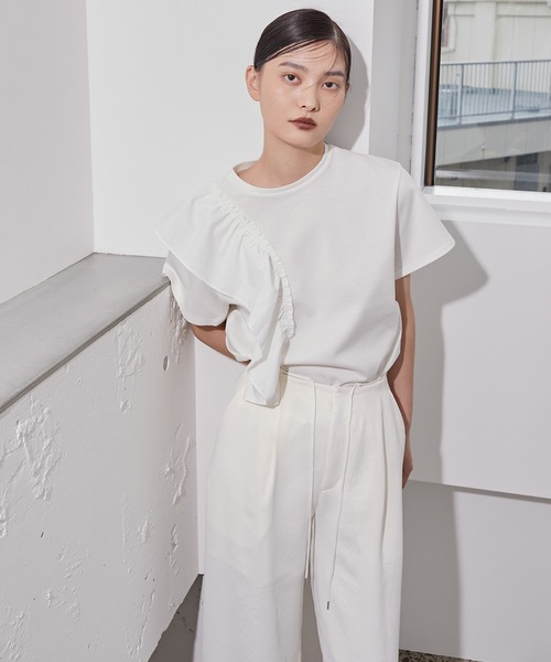 表面感のきれいなポンチ素材とタフタ素材をドッキングしたトップス。ギャザーラッフルをアシンメトリーにつけたアイキャッチなデザインがポイント。ギャザー部分を表に出すことでカジュアル感が出て、きれい目になり過ぎないところもポイント。丈感はややコンパクトで、インにもアウトにもしやすいサイズです。ラフにデニムやチノシリーズでも、きれい目のレーススカートにも、万能に合わせられるオススメのTシャツです。********************透け感:あり裏地:なし伸縮性:なし光沢感:なし生地の厚さ:普通液温40℃限度とし、手洗いができる********************照明の関係により、実際よりも色味が違って見える場合があります。またパソコン・スマートフォンなどの環境により、若干製品と画像のカラーが異なる場合もございます。予めご了承ください。※商品の色味は、商品アップ画像をご参照ください。※デザイン性のある商品の為、サイズ表記を必ずご確認ください。【LE CIEL BLEU】ファッションを愛するすべての女性に贈る流行発信型ショップをコンセプトのもと誕生した LE CIEL BLEU。グローバルな視野と凛とした強さ、そして女性らしさを兼ね備えた現代女性をイメージし、トレンド性の高いアイテムを展開。