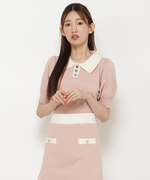 バイカラーの衿とパフスリーブで、レディな雰囲気のニットトップス 配色の衿で首元にアクセントをつくりながら、ワンポイントにボタンのハートでトレンド感もプラス。 ウエストのリブを幅広くしているので、ウエストをきゅっと絞って見せてスタイルアップも叶います。 ポリエステル100%の糸で、夏でも軽い着心地で清涼感のある素材です。 【styling】 同素材のバイカラーニットミニスカート(商品番号:20022413500389)とのセットアップでのスタイリングがおすすめ! 単品でも使いやすく、ロング丈のスカートやパンツと合わせれば、大人っぽくフェミニンに。 ミニスカートと合わせれば、ガーリーにとスタイリングの幅が広がります。 --------------------------- 透け感:なし 裏地:なし 伸縮性:あり 生地の厚さ:ふつう --------------------------- F:着丈48cm バスト86cm 肩幅30cm 袖丈30cm