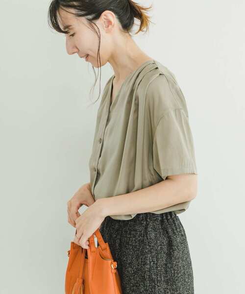 顔周りがすっきりと見えるVネックのきれいめブラウス。短すぎない袖丈なので二の腕をカバーし、肩まわりはタックでキレイなドレープ感を演出してくれます。 【2024 Spring/Summer】【24SS】 ※商品画像は、光の当たり具合やパソコンなどの閲覧環境により、実際の色味と異なって見える場合がございます。予めご了承ください。 ※商品の色味の目安は、商品単体の画像をご参照ください。 ▼お気に入り登録のおすすめ▼ お気に入り登録商品は、マイページにて現在の価格情報や在庫状況の確認が可能です。 お買い物リストの管理に是非ご利用下さい。 素材感 透け感 : ややあり(OFFのみ) 伸縮性 : なし 裏地 : なし 光沢 : ややあり ポケット : なし
