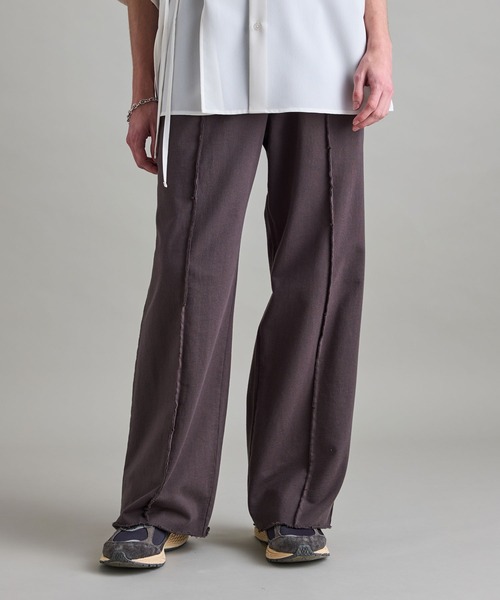 【 イージーケア 】デイリーユースで着回しの主役になるトレンド素材パンツ【 素材・機能 】薄手の肉感に抑えることで夏でも着用できる裏毛素材になります。手触りの良い優しいタッチの生地で、ストレスフリーで着用可能です。【 シルエット・デザイン 】フロント、脇をカットオフ仕様し、少しダメージを入れることでヴィンテージライクな仕上がりにしています。ストレートシルエットと裾の緩い広がりが適度な抜け感を演出し、非常に涼しげな印象です。ウエスト周りはシャーリングのゴム仕様なので体型を選ばずストレスフリーで着用可能です。【 カラー 】単品色でも使いやすいグレー、ブラック2色展開です。【 スタイリング 】非常に緩いシルエットなのでシンプルなビッグシルエットカットソーやオーバーシャツなどに合わせたルーズな着こなしが相性抜群です。素材、シルエットと個性的な印象でイージー仕様な作りなので男女共におすすめです。裏地:なし透け感:なし伸縮性:あり生地感・厚さ:普通ポケット:ありその他仕様:なし【 モデル着用サイズ 】MEN:身長178cm 着用サイズL※撮影場所やライティング、お使いのモニター環境によって色の見え方が異なる場合がございます。※商品のカラーは詳細画像の色味をご参照ください。