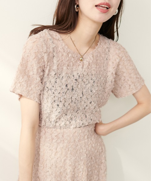 【2024SS natural couture】 花びらを散りばめた華やかトップス ■Design 花びらのような加工を施したチュールレースが全面に広がり、 1枚で華やかな印象を与えるトップスが登場。 広めの襟ぐりとぴったりめのサイジングで すっきりとしたシルエット。 透け感のある軽やかな素材を使用しているため、 これからの季節も涼しくお召いただけます。 華やかながらもシンプルなトップスなので ボトムスを選ばず様々なスタイリングが 楽しめる一着です。 ■Styling 同素材を使用したフラワーチュールレーススカートとの セットアップ着用がおすすめ。 透け感があるのでインナーの着用は必須です。 フェミニンにスカート合わせはもちろん、 パンツと合わせるとカジュアルスタイルの中にも女性らしさが出て◎。 系統を問わないので、着回し万能です。 カーディガンやジャケットのインナーとしても活躍するので、 夏から秋まで着回ししていただけます。 着丈が長すぎないのでアウトスタイルでも。 ■Fabric チュールならではの透け感のある 柔らかな素材を使用。 真夏にも涼しくお召いただけます。 ■Series 0341010760 フラワーチュールレーススカート ======================= お手入れ方法:手洗い 透け感:あり 裏地:なし 伸縮性:ややあり 光沢感:なし 生地感:透け感のある柔らかな生地感 ======================= ※着用、お取り扱いの際は、商品に付いている品質表示とアテンションタグを必ずご確認ください。 【お気に入り登録でお得な情報がいっぱい】 ・「商品のお気に入り登録」で再入荷通知や、ラスト1点の通知、セール通知をいち早く受け取ることができます。 ・「ブランドのお気に入り登録」で新商品や再入荷など、お得な情報を受け取ることができます! ※店舗の入荷時期は商品によって異なります。 店頭の在庫状況につきましては各店舗にてお問い合わせください。 ※撮影時の光の関係で、画面上の画像と実際のお色とでは若干の色差が生じる可能性がございます。 また、ご覧いただいているモニター画面や、お使いのブラウザによっても、お色の違いがございますことをあらかじめご了承くださいませ。