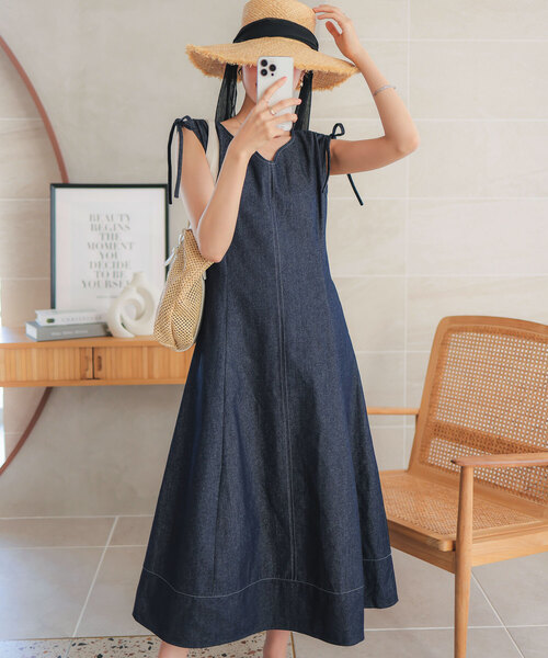 ハートネックとウエストからの美しいカーブラインが上品なでフェミニンな印象を演出。肩リボンは可愛さだけでなく、ショルダーのギャザー分量調整もできるのでお好みや体型にあわせて変化を楽しめます。 合わせる小物次第でカジュアルにもキレイめにも使いやすいワンピースです。 【素材・サイズ感】 程よいハリ感のあるデニム生地が、美シルエットをキープしてくれます。 配色ステッチがアクセントとなり他と差がつく1枚に。 M、Lの2サイズ展開。嬉しいポケット付き。 【STAFFコメント】 着映えが叶うトレンドのジーンズワンピース。 美シルエットを演出するカーブラインにデコルテをキレイに見せるVネック、 女性らしさを引き立てるリボンギャザーなど細かいデザインが大人可愛いロングワンピースです。 選べるサイズ展開で、私はフレア感を楽しみたいのでLサイズでゆったり着用しています。 旅行の際のリゾートワンピースにもおすすめです◎ キャップやスニーカーとカジュアルに合わせたりデイリー使いもできます♪ 《KOBE LETTUCE ー神戸レタスー》 プチプラレディースファッションからコスメまで、トレンドアイテムを豊富に取り揃えております。 毎シーズン発売されるインフルエンサーとのコラボ商品はSNSでも話題に。
