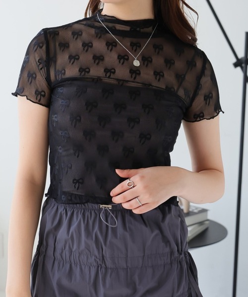 《バレエコアスタイルに♡ハイネックシースルーTシャツ》■デザイン・トップスの下にインナーとしてレイヤードするといつものコーデががらりとおしゃれな印象になります◎・トレンドのバレエコアスタイルにもぴったりなリボンモチーフのシースルートップス。・透け感があり、上品な大人の女性らしさを醸します。・同色のインナーを合わせて華やかなトップスとしてもデイリー使いしやすい♪■素材ポリエステル100%のさらっとやわらかい素材。伸縮性があり、透け感のある生地です。■スタイリング見せブラやベアトップをインナーにトップスとして着るのもかわいい◎ハイネックデザインなのでサロペットのインナーとしても使えます♪ジャケットやカーディガンのインナーに合わせると抜け感が出ておすすめです。------------------------------伸縮性:あり透け感:あり裏地:なし------------------------------------------------------------【スタッフが着用しました!】身長:158cm普段着用サイズ:Mサイズ今回着用サイズ:FREEサイズ・着用感柔らかく伸びる素材で着心地良く着れます◎クロップド丈でコンパクトですが程よくゆとりはあります♪------------------------------------------------@ulysses.ec.officialインスタオフィシャルアカウントにてアイテム情報更新中◎是非チェックしてみてください。