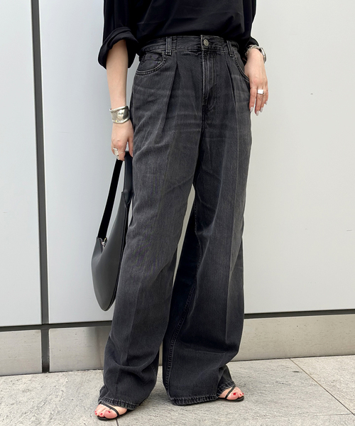 すっきり穿けるタック入りのワイドデニム。テンセル混のデニム地で落ち感があり、軽い着心地が特徴です。ワイドシルエットながら、タックが入ったすっきりとした腰回りでストンと落ちたシルエットに。シンプルなカットソーに合わせても主役になってくれるデニムは押さえておきたいマストアイテムです!【HAIKURE/ハイクル】ヨーロッパのデニム業界を牽引するイタリアのファクトリーが 2011 年に立ち上げた『HAIKURE』「サステナブル、透明性、デザイン」をコアバリューとし、ファッションとサステナブルを共存させたデニムコレクション。現代の新しいライフスタイルの一部になる商品づくりを目指しています。*********************透け感:なし裏地:なし伸縮性:なし光沢感:なし生地の厚さ:薄手~普通*********************※照明の関係により、実際よりも色味が違って見える場合があります。またパソコン・スマートフォンなどの環境により、若干製品と画像のカラーが異なる場合もございます。※商品の色味は、商品アップ画像をご参照ください。※メーカー型番:HEW03342DF146L0854※カラーについて弊社販売カラー名:メーカーカラー名ブラック A(002):BLACK TENCEL L0854※サイズについて弊社販売サイズ名:メーカーサイズ名24(024):2425(025):2526(026):2627(027):27モデルサイズ:H162 着用サイズ:25本体:洗濯機洗い(弱)
