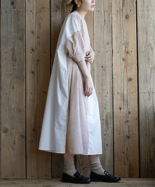 ストライプを取り入れて爽やかに身に纏うだけで一気に夏らしさが加速するストライプ柄。無地との切替でアレンジを加えたデザインで、より日常に取り入れやすい&こなれた印象です。グッドガールなシャツワンピきちんと感と可愛さを兼ね備えたシャツワンピ。裾のサイドスリットやバックのタックが程よいふんわり感を作り、体のラインを拾いにくい設計です。1枚で着て様になるのはもちろん、パンツ合わせや羽織りとしてのスタイリングなどの着回しもできて便利。素材ポリエステル60% コットン20%薄手でハリのある上品な素材感。細い線と太い線が組み合わされたシックンシン・ストライプがトラッドな印象です。淡色部分は透け感があるため、1枚で着るときにはペチコートを合わせるのがおすすめ。洗濯:洗濯機使用可※アイロンの際はあて布をご使用ください※お洗濯の際はネットをご使用ください