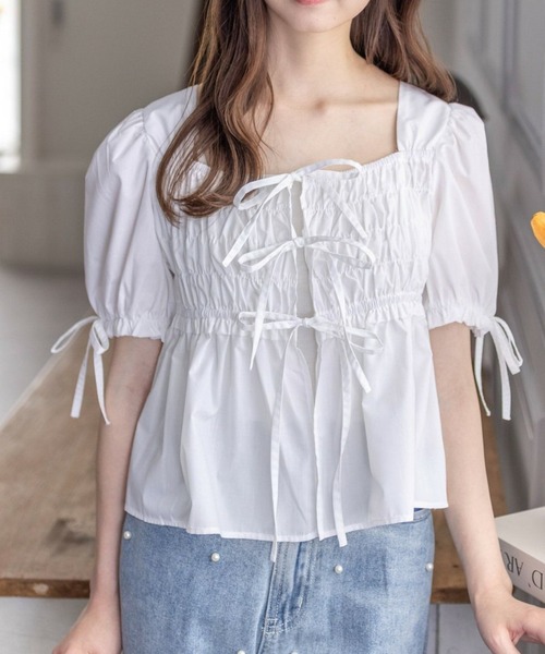 華やかな印象になる!リボン付きパフスリーブシャーリングブラウス 【デザイン】 フロントや肩部分にリボンがたくさんあしらわれたブラウスです。 フロントリボンを調節することで肌見せ間隔を変更していただけます♪ スクエアネックなのでデコルテラインを綺麗に見せてくれます! 【素材感】 着心地の軽いポリエステル素材 伸縮性:なし/ 透け感:オフホワイトのみ若干あり/ 裏地:なし 手洗いによる洗濯可 / ドライ・ウェットクリーニング可 【コーディネート】 デニムパンツにサンダル合わせが夏らしくオススメです! ショートパンツと合わせていただくのも◎ 【※お取り扱い上のご注意】 1:モニター環境等により実際の商品と多少色味が異なって表示される場合がございます。予めご了承下さい。 2:屋外で撮影された商品は、天候により多少実際のカラーと異なる場合があります。商品のカラーはトルソー(マネキン)の商品画像をご参照ください。 3:濃い色の商品は、お洗濯や摩擦等による移染にご注意ください。 4:末永くご愛用頂く為に、アテンションタグ・洗濯ネームを必ずご確認の上、着用又はお取り扱い下さい。 5:生産時期により、色、サイズ、デザイン、素材の質感が多少が異なる場合がございます。あらかじめ御了承下さいませ。