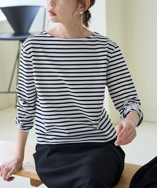 ベーシックさをキープしながらさりげない現代らしさをプラス。【素材感】・綺麗な目面がポイントのボーダートップス。【デザイン・シルエット】・横に広く開く、浅めのボートネックが特徴的。・細ラインのボーダー柄で取り入れやすい。・袖丈がしっかりとあり、さりげないトレンド感のある一枚。【カラー】・グレー系(09):オフホワイト×グレー・キナリ系(17):オフホワイト×ブラック・ブルー(44):オフホワイト×ブルー【スタイリングポイント】・細身のジーンズを合わせてプリントスカーフを首に巻き、パリジェンヌルックが完成。 ・ワイドパンツやキャスケットに合わせたマリンコーデも一押し。・同シリーズでKIDS(品番:GRM64040)も展開しているので、親子お揃いもおすすめ。-----------------------------裏地:なし透け感:キナリ系(17)はややあり伸縮性:なし生地感・厚さ:普通季節:秋・春-----------------------------※撮影時の光、お使いのモニター環境によって色の見え方が違う場合がございます。※モデル身長:165cm 着用サイズ:38