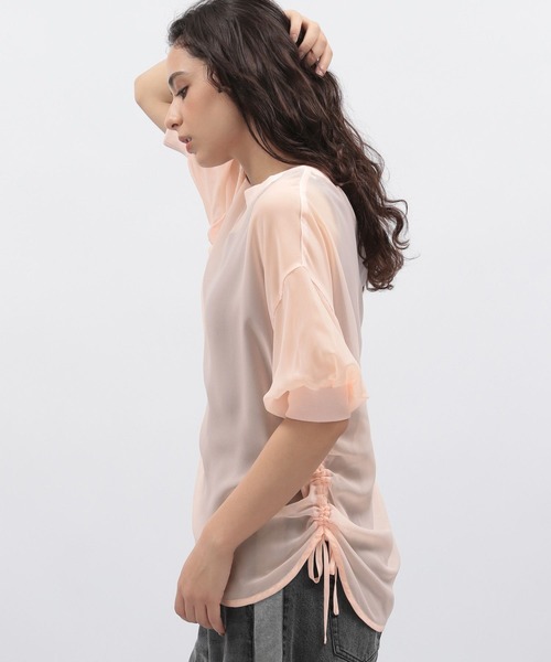 シアー感が涼しげなブラウス。5分袖ですっきりと見え、サイドにはドロスト紐をデザインしシルエットの変化を楽しむことも〇ウエストが隠れる着丈は体型カバーにもおすすめです。【素材】さらっとした薄手の素材感。【スタイリング】合わせるボトムを選ばずスタイリングできるアイテムです。インナーが透けるので合わせるインナーで印象も変わります。