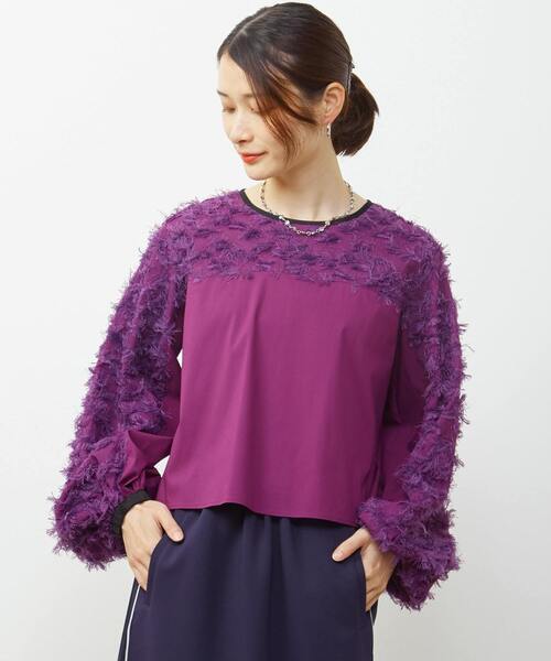 フリンジ風見えする素材で無地と組み合わせたデザインブラウス。 袖口と衿のパイピングが配色がポイントになっています。 袖口にゴムが入っているのでキュッとたくし上げて着るのがオススメです。 ■fabric ベーシックなシャツ生地と 綿ポリエステルのカットジャカードを使用
