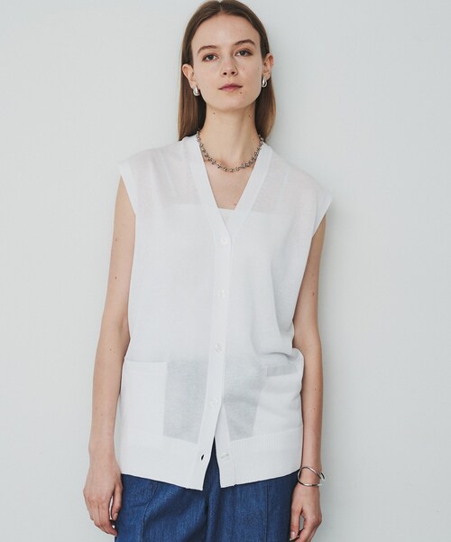 ■デザイン ベーシックなニットベスト。 ゆったりめのフォルムがリラクシーな印象。 ポケットが付いているのが嬉しいポイント。 ※ポケット数:横×2 ■素材 レーヨンの肌触りがやさしい素材。 派手にならない程度のラメのような光沢のある糸をミックスしている綺麗め素材です。 ■コーディネート 綺麗めのシャツ、ブラウスとのコーディネートはもちろん、ゆったりとしたフォルムでリラックス感があり、綺麗めの羽織にTシャツ等のカジュアルスタイルにするなどアクセントにもなります。 ※照明の関係により、実際よりも色味が違って見える場合があります。また、パソコン・スマートフォンなどの環境により、若干製品と画像のカラーが異なる場合もございます。 モデル情報:身長177cm B80 W60 H88 着用サイズ:2(M) 店舗へのお問い合わせ商品番号:R91-28501 ●製品寸法: 02(M):着丈72cm B109cm 肩幅42cm 備考: