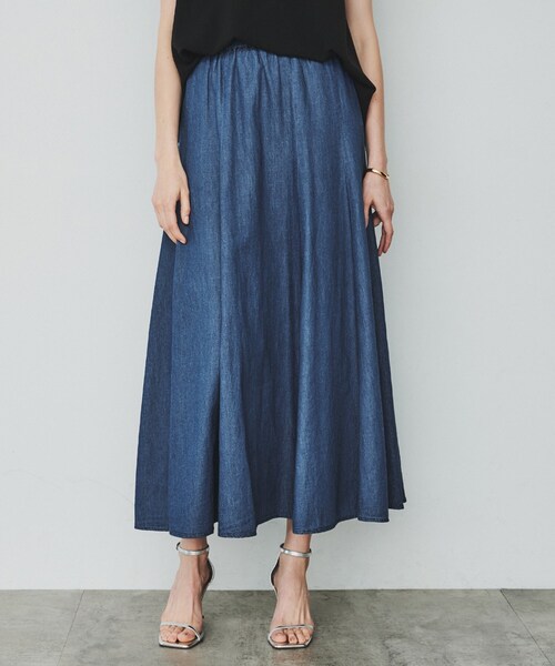 ■デザイン 纏うだけで女性らしさを引き立てる、8枚接ぎのロングフレアスカート。 たっぷりとしたボリューム感が裾周りに豊かなドレープを生じさせ、歩くたびに優雅に揺れるシルエットは、美しいラインを描きます。 ※ポケット数:横×2 ■素材 コットンに麻をミックスする事で清涼感と麻のナチュラルな艶観を加えたおしゃれなデニム素材に。 春夏の季節にぴったりな軽やかで涼やかな風合いが特徴です。 裏地なしで通気性も良く、長時間の着用でも快適に着用いただけます。 ※裏地なし ■コーディネート カジュアルな素材感ながらもクラシックなフォルムが特徴で、通勤スタイルからちょっとしたお出かけまで、幅広いシーンで活躍します。 シンプルなトップスと合わせてデイリーユースで楽しんだり、ブラウスやジャケットを合わせて洗練されたオフィススタイルにも。 足元にパンプスを合わせれば、キレイ目なスタイリングも仕上がります。 ※照明の関係により、実際よりも色味が違って見える場合があります。また、パソコン・スマートフォンなどの環境により、若干製品と画像のカラーが異なる場合もございます。 モデル情報:身長177cm B80 W60 H88 着用サイズ:2(M) 店舗へのお問い合わせ商品番号:R91-78601 ●製品寸法: 01(S):W65cm H100cm 総丈93cm 02(M):W68cm H103cm 総丈95cm 03(L):W71cm H106cm 総丈97cm 備考: