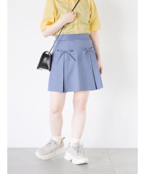フロントにあしらわれたリボンが可愛らしいアクセントになるスカート。ミニ丈のルックスになっているので、トレンドライクな印象を与えます。バックのウエストゴム仕様が程よいフィット感を演出。シャツやカットソーと合わせたコーディネートがおすすめです。-----------------------------------------------洗濯表記【手洗い可 石油系ドライクリーニング】透け感【なし】裏地【あり】-----------------------------------------------※商品画像は、撮影環境やお客様のご利用のPC・スマートフォンのモニター環境などにより実物と色味に差異がある場合がございます。【その他採寸】F ウエスト:[後ゴム仕様]64cm