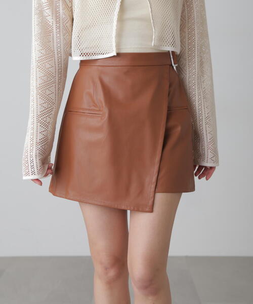 (fabric&design) 薄手のフェイクレザーを使用。 中はパンツ仕様になっており、安心して履いていただけるスカパンです。 前から見るとラップミニスカートのようなデザインで、ウエスト部分にシルバーバックルのベルトが付いているのがポイントです。 スカートの前身頃には玉縁ポケットをつけてシンプルになりすぎないデザインにしています。 センターバックがファスナーで開閉可能なので楽に着脱できます。 (styling) 秋冬にぴったりのレザー素材なのでニットやスウェットをウエストアウトで合わせて裾からチラ見せするのが可愛いです。 足元はブーツスタイルがおすすめです。 ■透け感:なし ■生地の厚さ:普通 ■裏地:なし ■伸縮性:なし ■光沢:ややあり ■シルエット:スタンダード --------------------------------------------------- ◆商品のお気に入り登録◆ お気に入りアイテムの値下げ・再入荷・在庫1点などの通知を受け取ることができます。 ◆ブランドのお気に入り登録◆ 新商品や再入荷、セール、クーポン配布などお得な情報を受け取ることができます。 ---------------------------------------------------