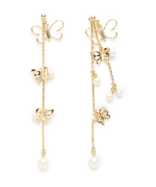 蝶とパールのモチーフを散りばめたロングピアス。揺れるたび光を反射して華やかな印象を誘います。チェーン部分を取り外すことで、バタフライモチーフのみのシンプルなバージョンとしても楽しめます。 ※照明の関係により、実際よりも色味が違って見える場合があります。 またパソコン・スマートフォンなどの環境により、若干製品と画像のカラーが異なる場合もございます。予めご了承ください。 商品の色味は、商品単品画像をご参照下さい。 ※商品画像はサンプルのため、色味やサイズ等の仕様に変更がある場合がございますので、予めご了承ください。