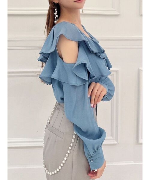 ラッフルと肩見せがポイントのブラウス ▽デザイン▽ 大きめのラッフルが顔周りを華やかな印象にしてくれます♪ ショルダー部分は開いておりさりげない肌見せがポイント。 ネックはすっきりと開けたことで抜け感が出て、 バックリボンがさりげなく女性らしさをプラス。 袖は透け感を出したことで長袖のボリュームスリーブでも重たく見えず、 ロングシーズン活躍するブラウスに仕上げました。 ▽カラー▽ 白・黒・青の3色展開。 ▽スタイリング▽ パンツでスタイリッシュなスタイリングも、 スカートでフェミニンなスタイリングにも万能にマッチ。 シンプルながらデザイン性のある1枚で、一気に華やかなコーデに仕上げます。