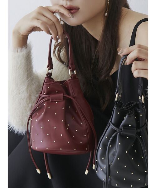 ゴールドの華奢なスタッズを全体にあしらったコンパクトバッグ ▽デザイン▽ 巾着スタイルで開閉もしやすく絞り方でフォルムが変わり、 マチもあるのでコンパクトながら収納力のあるバッグに仕上げました♪ ゴールドのスタッズがさりげなくコーデのアクセントになります。 コンパクトでどんなスタイリングにもピッタリ◎ ▽カラー▽ 合わせやすい黒と、トレンドの深みのある赤の2色展開。