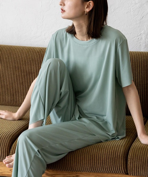 【デザイン】 スムースタッチルームウェア 上下セット ずっと触れていたい、とろみがある滑らか素材のルームウェア上下セット。 細リブ仕様のさらりとした薄い生地で、肌との接触面を軽減。 軽い着心地なので、蒸し暑い夏でも爽やかで快適におうち時間を過ごせます。 ボトムスのウエストはゴム仕様となっており、 ゆったりとしたシルエットで着用もらくちん。 前後差のあるスリットで動きやすく、パンツインしやすい仕様。 ズボンの両サイドにポケットがあり、ちょっとした小物やスマホを入れるのに便利です。 上下セットで着用するのはもちろん、単品で着用すればヨガやフィットネスでも大活躍。 【サイズ等】 トップス ●総丈:約68cm ●身幅:約54cm ●肩幅:約43cm ●裄丈:約43cm ●袖丈:約19cm ●袖幅:約19cm ●重量:約160g ボトムス ●総丈:約92cm ●股上:約32cm ●股下:約60cm ●ウエスト:約62cm(調節可能) ●ヒップ:約100cm ●裾幅:約23cm ●重量:約250g ------------------------- ●素材:ポリエステル95%、ポリウレタン5% ●裏地:なし ●伸縮性:あり ●生産国:中国 ●ポケット:あり ●その他付属品:なし ●透け感:光にかざすと手の形が見える程度 ------------------------- ※当店平置きにて測定しております。±1~2㎝の個体差が生じる場合がございます。 ※撮影環境により実際のカラーとやや異なる場合がございます。 画像をご参照の上、ご了承頂けますようお願い致します。 ◆商品のお気に入り登録◆ 完売カラーの再入荷通知や、ラスト1点の通知、 セールの通知も受け取ることができますので、是非ご登録ください。 ◆ブランドのお気に入り登録◆ 新商品や再入荷などの情報を受け取ることができますので、是非ご登録ください。