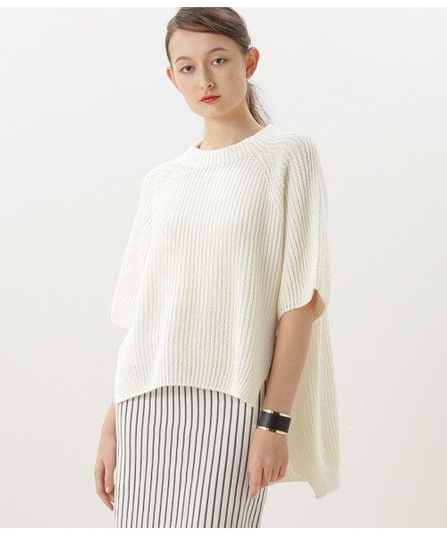 シンプルなコーディネートもこの1枚でトレンドスタイルにトレンドディティールのスリットを入れたサマーニットポンチョ。バックスタイルを長めのデザインに仕立てボリュームをコントロール。オーバーサイズなので上からばさっと羽織って着こなして。シャツ×スリムパンツに合わせてるのもおすすめです。