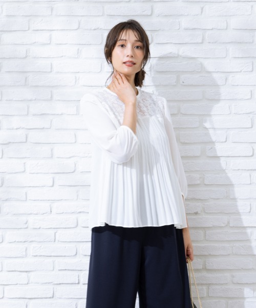 前後のヨーク部分をかぎ針編みのレースで切り替えた、ほんのりと抜け感を醸し出すブラウス。ふんわりとしたクロップドスリーブと女性らしくフレアにデザインされたプリーツシルエットがエレガントな佇まいを演出。フェミニンなスカートとの相性はもちろん、定番のパンツと合わせてもバランスのよいコーディネートに仕上がります。これからの季節のスタイリングに柔らかな雰囲気を添えてくれる一枚です。 ------------------------------------ <着用シーズン>夏 <伸縮性>なし <透け感>あり <ポケット>なし <生地の厚さ>薄手 <裏地>あり ------------------------------------- ※商品の色味は、撮影場所や光のあたり具合、お客様のお使いの機器により色味が違って見える場合がございます。予めご了承ください。 ※定価(税込)は、2024年6月28日のセール開始前の店舗における販売価格です。 9:肩幅38、バスト102、袖丈42、ゆき丈-、着丈-、身丈61.5