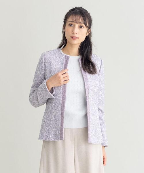 ミックストーンの美しい色合いが印象的なノーカラージャケット。厚みの出すぎないすっきりとしたシルエットが魅力。前立て部分はボタンを使わずにホックで留める仕様にしたことで、とことんシンプルで洗練されたデザインに。 ■Buyer’s voice オフィスシーンはもちろん、セレモニーやオケージョンシーンなどでも活躍するアイテムは一枚持っていると便利なアイテムです。合わせるブラウスや、スカートのデザインによっても雰囲気の異なる着こなしが楽しめます。 ------------------------------------ <伸縮性> なし <透け感> なし <ポケット> あり <生地の厚さ> やや厚手 <ウォッシャブル> 不可 <裏地> あり <ウエストゴム> なし ------------------------------------ ※定価(税込)は、2022年06月29日のセール開始前の店舗における販売価格です。 9:肩幅37、バスト92、袖丈58、ゆき丈-、着丈59 13:肩幅39.5、バスト98、袖丈59、ゆき丈-、着丈60.5 11:肩幅38、バスト94、袖丈58.5、ゆき丈-、着丈59.5