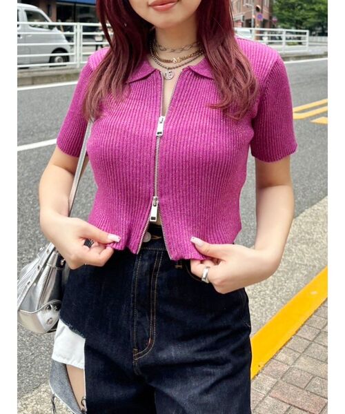キラキラのラメを引きそろえた襟付きのコンパクトニットトップスです。 フロント部分はダブルZIPのデザインとなっており、上下を開いて抜け感のあるスタイリングがおすすめとなっています。