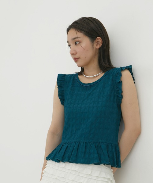 フリルがポイントの着回しがきくコンパクトトップス。1枚着でもレイヤードスタイルにも万能に使えるカットソー。◆2024-25 秋冬◆【デザイン・シルエット】フリルディテールがレディな雰囲気を演出!広がりすぎない裾ギャザーフリルがポイントに。ウエスト周りはシャープな印象に仕上げています。夏から秋シーズン大活躍する1枚着トップスです。 <POINT>・表面の凹凸がチェック見えするカットソー素材。フィット感があり肌触りの良い素材。・首回りのベルベットリボンで重厚感◎秋気分を演出。・1枚着、レイヤードアイテム、ジャケットのインナーなど汎用性の高いアイテム。 【素材】さらっとした着心地の素材感。気軽に洗濯機洗いができるイージーケア商品。 【カラー】 黒、白、ターコイズブルーの3色展開。 【おすすめのスタイリング】1枚でももちろん着映えしますが、裾の切り替えはリボンディテールフェイクファービスチェ(BVF54020)とベストバランスになっておりセットでの着用はおすすめ! ----------------------------- 裏地:なし 光沢感:ややあり 透け感:ややあり(ホワイトのみ) 伸縮性:あり 生地の厚さ:やや薄手 季節:夏、初秋 ----------------------------- 【モデル着用サイズ】 全色モデル身長:163cm、着用サイズ:F ※画像の商品はサンプルです。 実際の商品と仕様、加工、サイズが若干異なる場合がございます。 ※重量はサンプルFサイズの測量になります。サイズによって多少異なる場合があります。 ※画像によっては実際の色味と異なる場合があります。正しい色味は生地アップ画像をご確認ください。