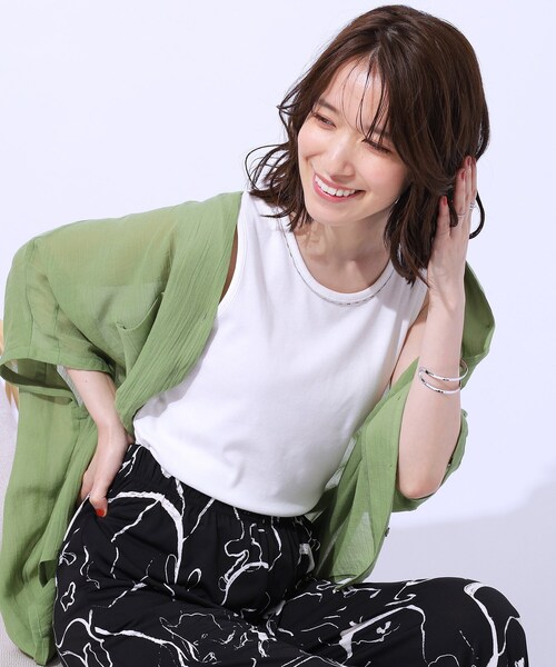 【デザイン】胸元にビーズがあしらわれた、一癖あるデザインがお洒落なタンクトップです。ベーシックな形で様々なアイテムに合わせやすく、デイリー使いにもおすすめです。目立ちすぎないさりげないビーズ使いが、大人っぽく、どんなシーンのコーディネートにも馴染みます。アクセサリーなしでも胸元をキラッと華やかに演出してくれます。【スタイリング】シャツやブラウスなどのインナーとして合わせて、胸元からちらっとビーズを覗かせる着こなしが上品でこなれ見えします。カーディガンやシアー感のあるトップスに合わせた着こなしもおすすめです。【素材】綿混の着心地のよいジャージー素材を使用しています。※照明の関係により、実際よりも色味が違って見える場合があります。また、パソコン・スマートフォンなどの環境により、若干製品と画像のカラーが異なる場合もございます。モデル情報:身長166cm B80 W59 H85 着用サイズ:02(M)店舗へのお問い合わせ商品番号:C62-19011●製品寸法:02(M):総丈58cm B82cm 肩幅31cm03(L):総丈59cm B88cm 肩幅32cm04(LL):総丈61cm B94cm 肩幅34cm備考: