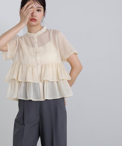 ほどよい透け感とフリルディテールを組み合わせた、大人顔なバンドカラーブラウスです。2段のフリルディテールを高めに入れて視線を引き上げつつ、襟ぐりのバンドカラーとの対比で甘くなり過ぎない印象で着ていただけます。シアー素材のゆったりめなペプラムシルエットに、二の腕をカバーしてくれる袖丈も嬉しい。お持ちのインナーを合わせていただき、デニムパンツやマニッシュなパンツと合わせたコーディネートがお勧めです。●取り扱いについては、商品についている品質表示でご確認ください。●撮影はサンプル商品で行っている為、仕様とサイズが異なる場合がございます。●スタジオ及び屋外で撮影した着用画像は、光の当たり具合やご覧のモニターによって色味が違って見える場合があります。予めご了承ください。●生産時期により色・素材・サイズ感など多少異なる場合がございます。予めご了承ください。≪お買い物をよりお楽しみいただくために≫・「商品のお気に入り登録」再入荷通知や、ラストの通知、セール通知も受け取ることができます。・「ブランドのお気に入り登録」新商品や再入荷など、お得な情報を受け取ることができます。