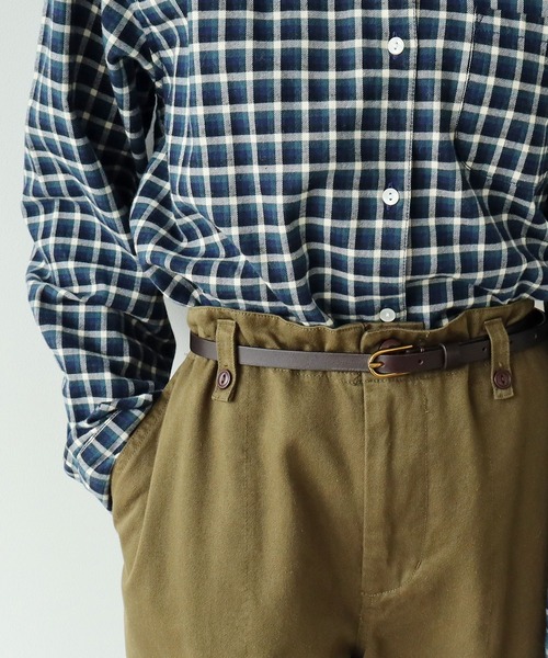 PAR ICIオリジナルの牛革ベルト。コーディネートに馴染む細身の幅感と、やわらかな曲線を描くめずらしい形のバックル。微妙にラウンドした剣先がさりげないポイントです。バックルのカラーはアンティークゴールド。光りすぎず程良くアクセントとなり、こなれた雰囲気でつけていただけます。内側にはさりげないブランドロゴの型押し。使い始めは硬くハリがありますが、使い込むうちに柔らかく風合いが出ます。ブランドらしいメンズライクな洋服に、あえて華奢なベルトでメリハリをつけるのもおすすめ。ウエストのシルエットに響きにくいすっきりとした使いやすい厚みも魅力です。【素材の特性・お取り扱いの注意】・取り扱いの注意については取り扱い表示をよくご確認の上、着用をお願い致します。・天然素材を使用している為、水や汗などで濡れた際は風合いが変化し硬くなることがございます。お取り扱いには十分ご注意下さい。また乾摩擦・湿摩擦により色落ちや色移りの可能性がございます。濡れた際は速やかに衣服等から遠ざけ、柔らかい布で叩くように水気を取り陰干しして下さい。・ベルト裏側に天然素材特有のざらつきがある場合がございます。あえて裏側に革を重ねないことで、薄く扱いやすいカジュアルな製品に仕上げております。※撮影画像は、光の当たり具合やモニターの環境により色味が違って見える場合があります。あらかじめご了承ください。