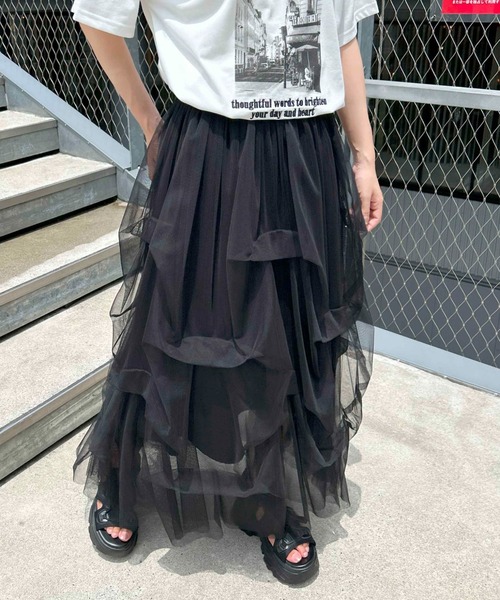 2024 SS 春夏アイテム 【ふわっと軽やかなチュールが目を惹く女性らしいボリュームスカート】 ▼Design 変則的にタックを入れたチュールが表情たっぷりのスカート。 360度かわいいを演出♪ 贅沢に使ったチュールがコーディネートを一気に華やかに仕上げてくれます。 立体感のあるデザインがシルエットを拾いすぎないので 腰回りやヒップラインを気にせず履けるのもうれしいポイント。 ウエストから裾にかけてボリュームが広がっていくデザインなので、 全体のバランスもすっきり見せてくれます♪ 透け感のある生地も同系色の裏地付きなので安心。 ▼Styling デザイン感が強く、人とかぶらないようなスカートをお探しの方にイチオシのボトムス。 あえてトップスはTシャツなどシンプルな合わせで スカートを目立たせるスタイリングがおすすめ♪ ・ウエストゴム 【以下グレー参考。カラーにより多少の誤差あり】 ・透け感:透ける(表地) ・伸縮性:なし ・生地の厚さ:薄い ・裏地:あり ▼Recommend ・フレアスカート ・ロングスカート ・チュール ・ふわふわ ・甘辛MIX ・大人カジュアル ・フェミニン ・ガーリー ・きれいめ