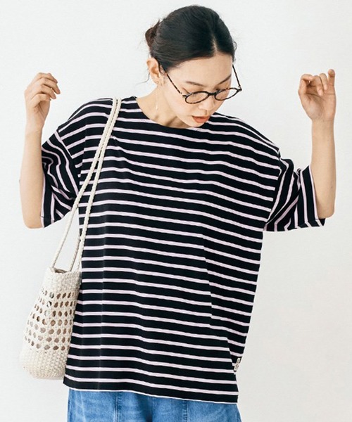 定番アイテムのボーダーTシャツを、アンドマイラらしく大人な雰囲気で作りました。 生地は綿レーヨン素材を使い、さらりとなめらかな肌ざわりに仕上げています。 レーヨンのほどよい光沢と、とろみのある落ち感が上品なボーダーTシャツ。 色組みにもこだわり、グレー×黒・黒×薄ピンク・ブルー×チャコールの3種類にしました。