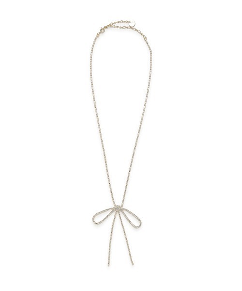 【2本のテールが胸元で揺れるリボンネックレスで顔周りを華やかに演出】【Design/Styling】コーディネートのトレンド感を一気に盛り上げるリボンチェーンモチーフのアクセサリーがお目見え。シルバーとゴールド、イエローの3色展開にてご用意しました。シルバーとゴールドはラインストーンチェーンを使用しており、キラキラと華やかにデコルテを彩ります。イエローは艶感があってしなやかなベネチアンチェーンを使用し、華奢なデザインです。短くしてチョーカー風にもご使用いただけます。※照明の関係により、実際よりも色味が違って見える場合があります。またパソコン・スマートフォンなどの環境により、若干製品と画像のカラーが異なる場合もございます。予めご了承ください。商品の色味は、商品単品画像をご参照下さい。 ※商品画像はサンプルのため、色味やサイズ等の仕様に変更がある場合がございますので、予めご了承ください。