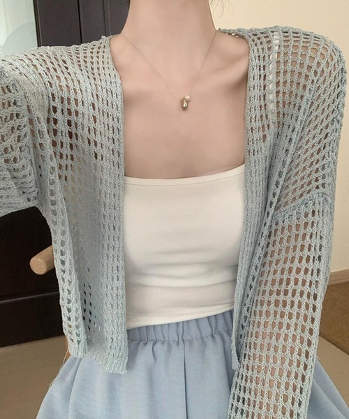 軽やかで通気性の良いデザインが特徴。夏の涼しい夜や春秋の季節の変わり目にぴったりのアイテムです。オープンワークのメッシュ素材を使用しており、スタイリッシュでカジュアルな印象を与えます。どんなコーディネートにも合わせやすく、重ね着スタイルを楽しめます。 用途: 日常のカジュアルな着こなしや、リゾート地での軽い羽織り物として、また室内での冷房対策など、様々なシーンで活用できます。 シンプルながらもトレンド感のあるデザインで、コーディネートに軽やかさと涼しさをプラスします。