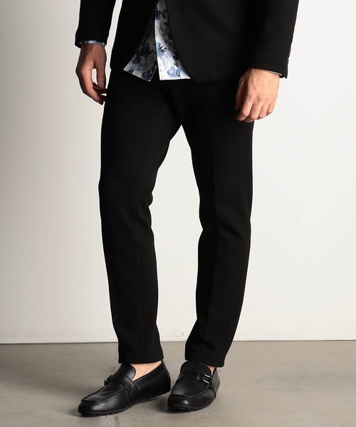 ■デザイン イージーパンツ仕様のスラックスデザイン。 素材感を活かしたシンプルな飽きの来ないデザインに仕上げています。 同素材でジャケット(メーカー品番:4465-3530)を展開しておりますので、セットアップでのスタイリングもおすすめです。 ■サイズ ウエストシェイプを入れた綺麗なシルエットで、細身のサイズ感です。 ■素材 09ホワイト×ブラック,49ブラック,67ネイビーには表面に綿糸、裏面にポリエステル糸が出るように編み立てたWフェイスのカットソー素材を採用。 表はカノコ組織で表面感を出し、カノコ目の間から見えるチラチラとした光沢が魅力の素材です。 91トップグレー,92チャコールにはポリエステルの杢糸とポリウレタンの混紡糸で編み立てたWフェイスのジャガード素材を採用。 杢調の独特な色合いとキルトステッチの様な細かなダイヤ柄をジャガードで表現しています。 合繊ならではの上品な光沢も魅力の素材です。 どちらの素材も裏面は天竺組織ですので袖通りが良く、カットソー素材ならではのストレッチ性がストレスフリーな着心地を提供してくれます。 伸縮性:あり 生地の厚さ:普通 加工:なし