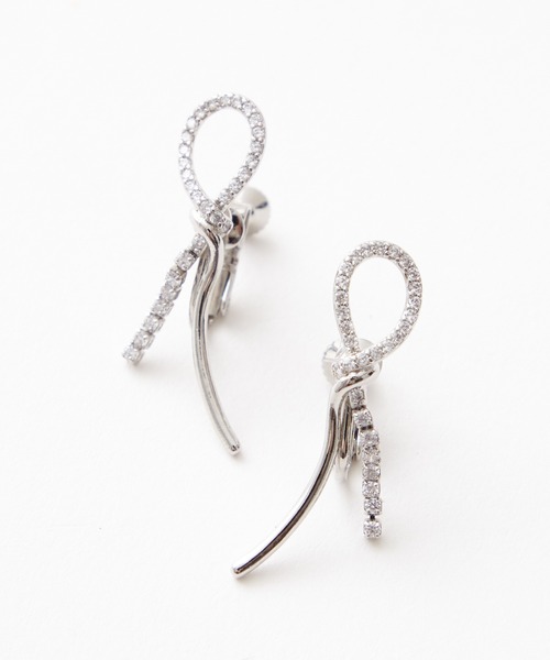 片リボンのようなモチーフが目を惹くイヤリング。モチーフにはガラスビジューをあしらい、小ぶりながらも存在感のあるデザインです。 曲線のパーツを内側に使用することで、フェイスラインに沿いながら顔映りを明るくしてくれます。 ネジバネ式の留め具で痛くなりにくく、華奢で軽い付け心地です。 同デザインのネックレス(型番:0353-4-36800)とセットで付けるのもおすすめです。 ※照明の関係により、実際よりも色味が違って見える場合があります。 またパソコン・スマートフォンなどの環境により、若干製品と画像のカラーが異なる場合もございます。 予めご了承ください。
