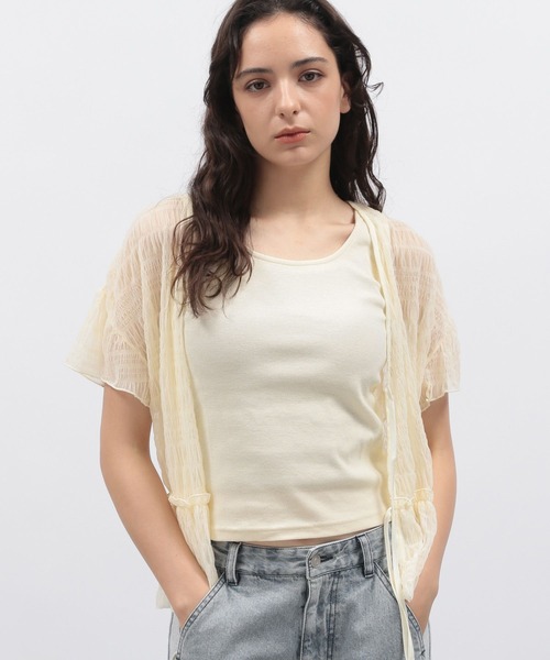カーディガンとタンクトップがセットになったアイテム。 シャーリングデザインがアクセントになり透け感が涼しげで、さりげない肌見せを楽しめる1枚です。 フロントのリボンデザインもポイントになり、カーディガンはもちろんプルオーバー風の着こなしも〇 【素材】 伸縮性のある繊細なシアー素材。 【スタイリング】 コンパクトなシルエットなのでボリュームのあるボトムとの相性も〇 別々でのスタイリングもできるアイテムです。