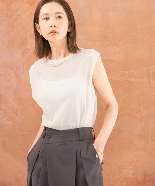【コーディネートに新鮮さをプラスするラメチュールタンクトップ】トレンドライクなチュール素材が、程良い肌見せを演出するタンクトップ。ラメ入りチュールを使用し、上品さも華やかさもある一着に仕上げました。ヒップ周りをカバーできる着丈も魅力ポイント◎マンネリ化したジャケットスタイルや、シンプルなカットソーにレイヤードするだけで様になります。滑らかな着心地で、シンプルながらも魅力のつまったアイテムに。※この商品は、素材の編み方の性質上、引っ掛け、引っ掛かりが起きやすい性質を持っています。お取り扱いには充分ご注意ください。※着脱時・着用時には、ベルト、バッグ、アクセサリー、周囲の壁などとの摩擦や引っ掛かりにご注意ください。※その他お取り扱いに関しましては、商品に付属のアテンションタグをご覧ください。※商品画像は、光の当たり具合やパソコンなどの閲覧環境により、実際の色味と異なって見える場合がございます。予めご了承ください。※商品の色味の目安は、商品単体の画像をご参照ください。▼お気に入り登録のおすすめ▼お気に入り登録商品は、マイページにて現在の価格情報や在庫状況の確認が可能です。お買い物リストの管理に是非ご利用下さい。素材感透け感 : あり伸縮性 : あり裏地 : なし光沢 : ありポケット : なし