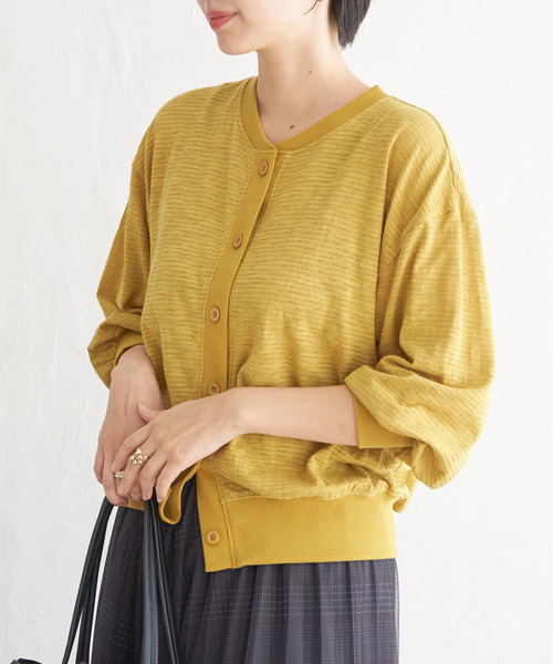 Tシャツやブラウスの上からさらっと羽織れるカーディガン。 ジャストな着丈が使いやすく、細身のボトムはもちろん、ワイドパンツなどボリュームのあるボトムとも合わせていただけます。 【素材】 細かいピッチのボーダーで、淡色はやや透け感のあるカットソーとリブ使い。 【デザイン】 カットソーのライトな作りのカーディガン。 袖口はパフスリーブでややボリュームを付けました。 【ikkaポイント】 少しだけ透け感があり、軽い感覚で使えるカットソーカーディガン。 ジャストなサイズ感と、パフスリーブがフェミニンな印象。 フロントはボタンを閉めて、トップス風にした着こなしもおすすめです。