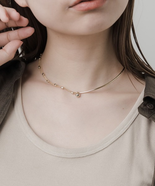 【ハーフ&ハーフの個性派デザイン】 ●チェーンとメタルラインをミックス ●チョーカーのようなタイトなルックス ●肌になじむゴールドメタル チョーカーのようなショートデザインでネックラインをスッキリ見せてくれるネックレス。 チェーンとメタルラインを組み合わせたルックスが、シンプルながら個性が光るディテールに。 デコルテラインを美しく見せてくれる繊細な作りと、肌にスッとなじむゴールドメタルがよりレディーさを演出してくれます。 【2024 Autumn/Winter】【24AW】 ※金属アレルギー症状が出にくいチタン、ニッケルフリー素材、ステンレス等を使用しています。すべての方にアレルギーが起こらないということではありませんので、万が一アレルギーの症状が出ましたら直ちに使用を中止してください。 ※メッキ製品(特に銀メッキ)は変色しやすいため、こまめなお手入れで防止してください。長期放置やスプレー香料などの同時使用は、特にお避けください。 ※メッキ製品は、アレルギー体質の方や体調が低下している方など、かぶれることがあります。肌に異常を感じた時はご使用をお止めいただき専門医にご相談ください。 ※アクセサリーは壊れやすいものです。取り扱いに注意していただき大切にご使用いただけるようお願い申し上げます。 総重量 : 約8.5g ※商品画像は、光の当たり具合やパソコンなどの閲覧環境により、実際の色味と異なって見える場合がございます。予めご了承ください。 ※商品の色味の目安は、商品単体の画像をご参照ください。 ▼お気に入り登録のおすすめ▼ お気に入り登録商品は、マイページにて現在の価格情報や在庫状況の確認が可能です。 お買い物リストの管理に是非ご利用ください。 -