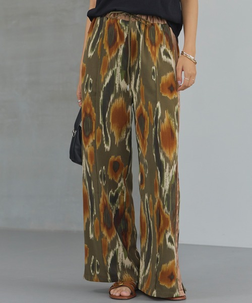 【-3kg見え】センターシームとサイドラインがマイナス3キロ見えの秘訣!スタイリングの主役になる、ニュアンス柄イージーパンツ■デザインぼかしをかけたような抽象的な総柄、カラーによって柄の異なる2色展開です。ゆったりとしたサイズ感ですが、サイドスリットで抜け感を演出。センターシームとサテンのサイドラインがアクセントになりすっきりと見せてくれます。着脱しやすいウエストゴム仕様、ウエストの内側にはドローコードが通っているのでサイズ調整も可能です。■素材さらっと落ち感のあるシーズンレスで着用可能な素材。■コーディネートパンツが主役になるようシンプルなトップスと合わせたスタイリングがおすすめ。チュニックやワンピースとのレイヤードにも活躍します。・裏地付き・サイドポケット有・お手入れ方法:手洗い可・マルチサイズ展開/大きいサイズ対応(M/LL/3L/4L/5L)---------------------------------------透け感:なし裏地:あり伸縮性:なし生地の厚さ:やや薄手---------------------------------------【お買いものをよりお楽しみいただく為に♪】▼商品のお気に入り登録(ハートマークをクリック)お気に入りアイテムの完売カラーの再入荷通知や、ラスト1点の通知、セールの通知も受け取ることができます。▼ブランドのお気に入り登録新商品や再入荷など、クーポン配布などのお得な情報を受け取ることができます。■商品注意事項■※洗濯による他の衣類への色移り、着用時の水、汗、摩擦による色移りにご注意ください。※商品画像は、光の当たり具合やパソコンなどの閲覧環境により、実際の色味と異なって見える場合がございます。予めご了承ください。※末永く愛用頂く為に、アテンションタグ・洗濯ネームを必ずご確認の上、着用又はお取り扱い下さい。※生産時期により色味が多少異なる場合がございます。予めご了承ください。