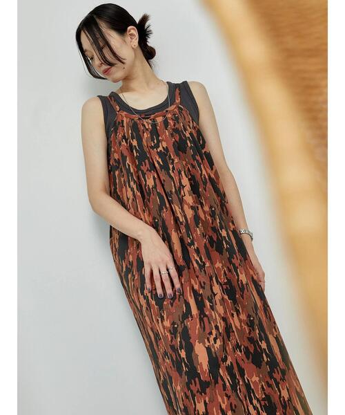 アーティスティックなプリントデザインが存在感を放つキャミワンピース。タックの生み出すゆるやかなフレアシルエットで、大人の女性らしさを演出してくれます。軽やかにスタイリングできる楊柳生地もポイント◎着こなしもサマ見えする存在感のあるアイテムです。br>※商品画像は、撮影環境やお客様のご利用のPC・スマートフォンのモニター環境などにより実物と色味に差異がある場合がございます。