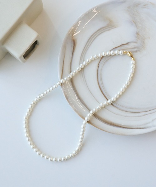 ひとつ備えておくだけで安心のショートパールネックレス。【デザイン・シルエット】 ・ベーシックサイズのフェイクパールを用いたショートネックレス。 ・トレンドに左右されず使える、エターナルなアイテム。 ・マグネット式で着脱も楽ちん。 【カラー】 ・ゴールドのみの展開(留め具のカラー)。 【スタイリングポイント】 ・フォーマルシーンに活躍。 ・ボーダーカットソーや、シンプルなクルーネックTシャツに合わせる日常使いも一押し。 ※撮影時の光、お使いのモニター環境によって色の見え方が違う場合がございます。