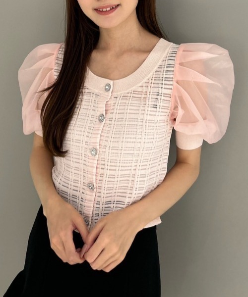 【袖デザインとラメ入りチェックデザインとの融合で女性らしさが引き立つカーデが登場】【Design】透け感のあるチェックの編み地のニットに、今らしいビジューボタンにボリューミーな袖をあしらったフェミニンな印象のアイテムです。夏らしいサラッとしたタッチ感のニットは、ラメ糸が編みこまれていても派手過ぎない優しい印象に。立体的なシアー感のあるチェック柄は雰囲気にぴったりの軽やかさを出し、デイリーに着やすいデザインに仕上げました。パンツにもスカートにも合わせやすいシンプルなデザインも魅力です。また、前後逆にしても着用できることや、カーディガンとしても着用できる優秀なアイテムjです。【Color】爽やかなWHT、フェミニンなL/PNK、クールなBLKの3色展開です。■透け感:あり■光沢感:あり■伸縮性:袖:なし、身頃:あり■裏地:なし▼商品のお気に入り登録お気に入りアイテムの値下げ・再入荷・在庫1点などの通知を受け取ることができます。 ▼ブランドのお気に入り登録新商品や再入荷、セール、クーポン配布などお得な情報を受け取ることができます。こちらの商品はrienda独自の採寸方法となっています。本サイトのサイズガイドと採寸方法が異なる場合がありますのでご了承ください。