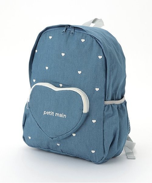 ハートポケットの周りに刺しゅうを配したデザインが可愛らしいリュックです。整理しやすくきれいに収納できるポケットを外側と内側に完備しました。肩のベルトをずれにくくするチェストストラップがついているのもうれしいポイント。背面には通気性に優れたメッシュ素材を使用しており、汗による蒸れを防いでくれます。内側にお名前を記入できるタグつき。