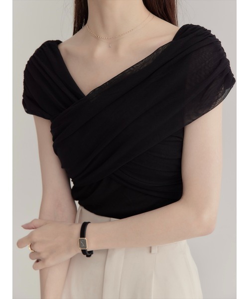 【デザイン&ディテールポイント】アシンメトリーなクロスデザインが目を惹くasymmetry cross tulle topsフロントとバックネックの深さが程良い肌見せに。肌触りの良いストレッチ生地にチュールの異素材の組み合わせが、ストレスフリーかつ上品見えのアイテム。合わせるボトムスによって、フォーマルにもデイリーにも使える万能トップスです。【コーディネートポイント】テーパードパンツやタックパンツと合わせて、スタイリッシュに。フレアスカートにインして、上品かつフェミニンなコーデに。華奢なネックレスを仕込むと、デコルテをより綺麗に演出します。