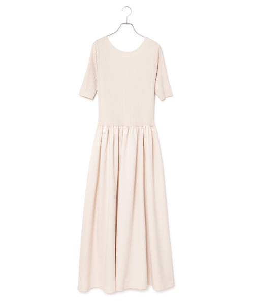 【素材】 シルク混リブニットとポリエステル100%のアムンゼンダブルクロスのドッキング使い 【デザイン・シルエット】 後開きのリブニット部分はフィット感のあるシルエットになっていて、布帛スカート部分はふっくらとした分量感があり、1枚で決まるワンピースになっています。 ※ハンガーにずっと掛けておくとニット部分が伸びてしまうので、保管の際お気を付けください。 【カラー】 ブラック、オフホワイトの2色展開 【おすすめのスタイリング】 1枚で決まるワンピースなので、合わせるシューズ、バック、アクセサリーで表情を変えて見せてください。上からジャケットやカーデ合わせでも使えるので汎用性もあります。 ---------------------------- 透け感:ややあり(オフのみ) 裏地:なし 伸縮性:あり 光沢感:なし 生地の厚さ:中肉 ポケット:なし 開き方:かぶり ---------------------------- 【モデル情報】 モデル身長:168cm 着用サイズ:38 ※画像の商品はサンプルです。実際の商品と仕様、加工、サイズが異なる場合がございます。 ※撮影場所やライティング、お使いのモニター環境によって色の見え方が異なる場合がございます。 ※商品のカラーは画像の色味をご参照ください。動画は仕様説明のため、色味が実物と異なる場合がございます。